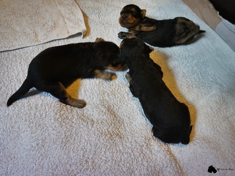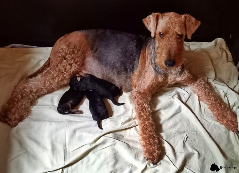 Seit drei Wochen versorgt Wiega in ihrem dritten Wurf drei entzückende Airedale-Mädchen. Der Vater der Kleinen ist “ Glenroses Rocket Man“ (VDH-Jugendsieger, Annual Trophy Junior Winner, Deutscher Jugend-Champion VDH, KfT Jugendchampion, VDH Frühjahrssieger).