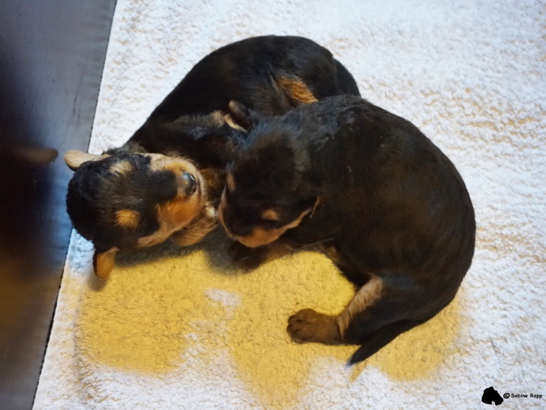 6 Wochen sind Wiegas Töchter mittlerweile geworden. Und nun sind es unverkennbar „richtige“ kleine Airedales. Sie erforschen eifrig ihre (noch) kleine Welt. Die Wurfkiste suchen sie meistens nur noch zum Schlafen auf.
