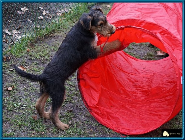Es ist ein ganz prima Hund, mit dem wir viel Freude haben. Morgen fangen wir mit der Hundeschule an.