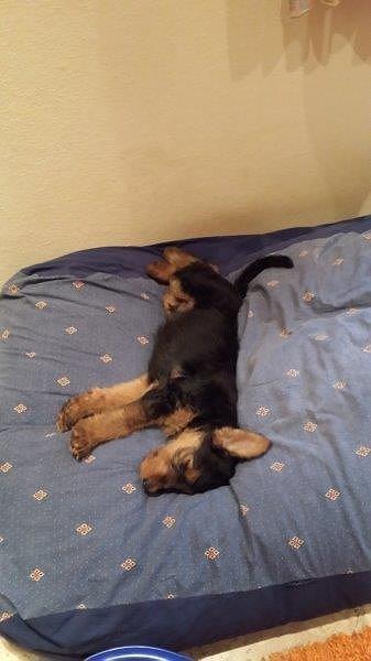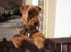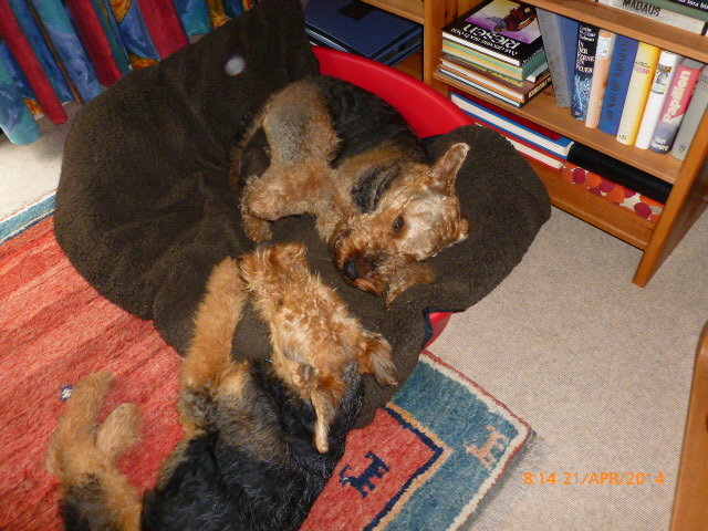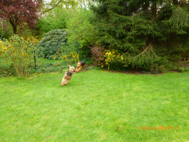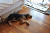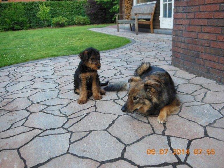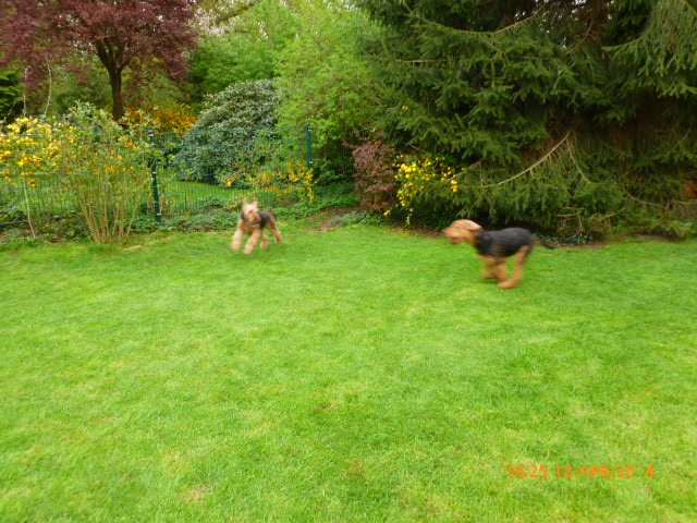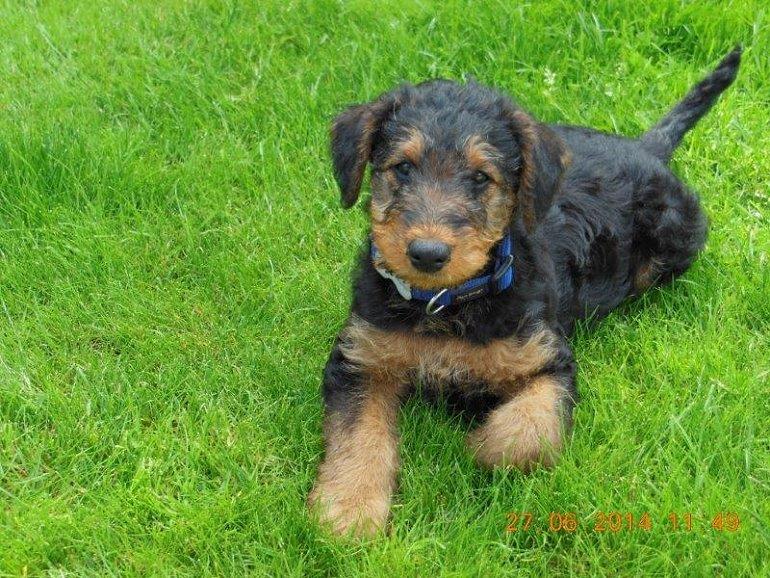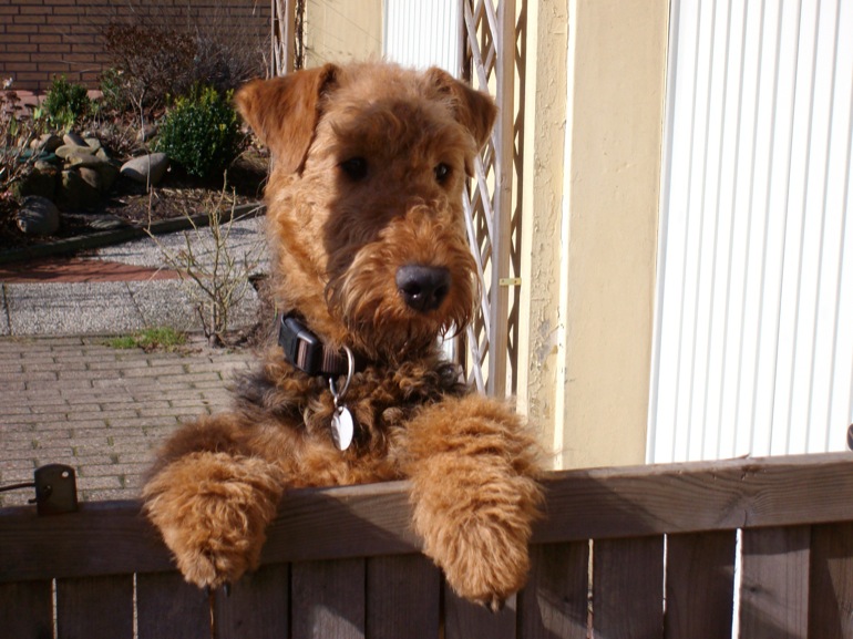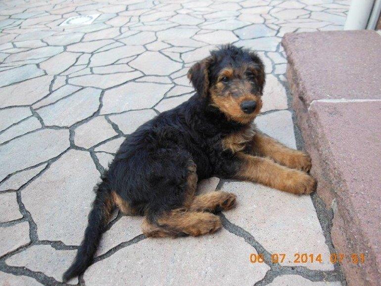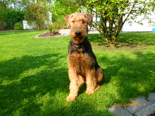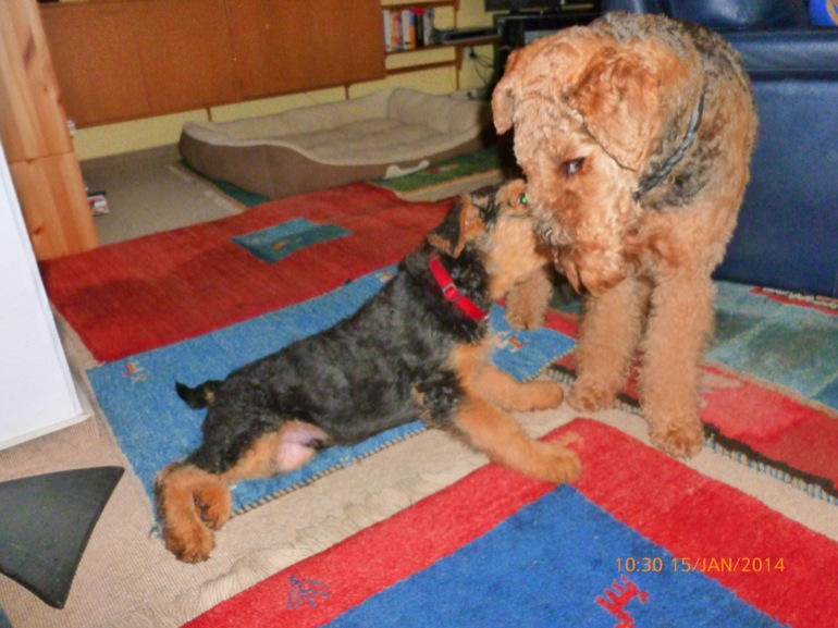 nun bin ich schon eine Woche in meinem neuen Zuhause und fühle mich „Airedaleterrierwohl“. Zum Beweis hier ein paar Fotos. Ich bin schon ein kleiner Racker geworden und habe auch eine ganz liebe „Ersatzmama“, die Ria. Auf der darf ich rumturnen und rumzuckeln… und wenn ich dann müde bin auch mit ihr kuscheln. Ansonsten geht es mir gut und ich bin schon „richtig“ groß geworden. Meine Familie hat mich ganz doll lieb und ich sie auch.