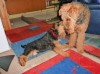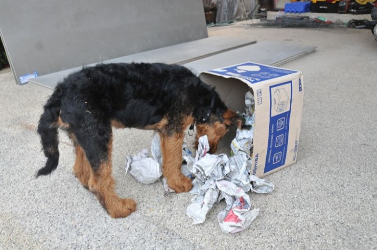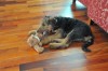 Quincy liebt es, Leckerlis aus einem Pappkarton mit zusammengeknülltem Zeitungspapier herauszusuchen oder einen Ball zu rollen, aus dem Leckerlis herauspurzeln. Zu Quincys Freude spielt sich sehr viel Leben auf dem Fußboden ab. Wird einfach eine Bastmatte ausgelegt und darauf wird gerastet. Findet Quincy gut. Er legt sich gerne dazu.