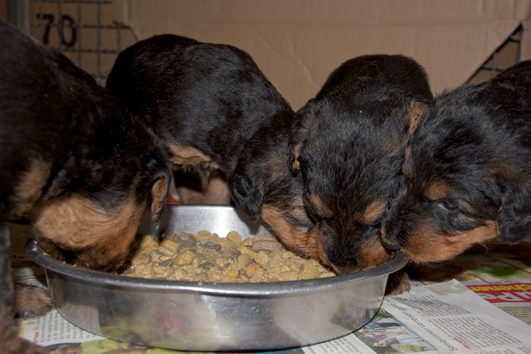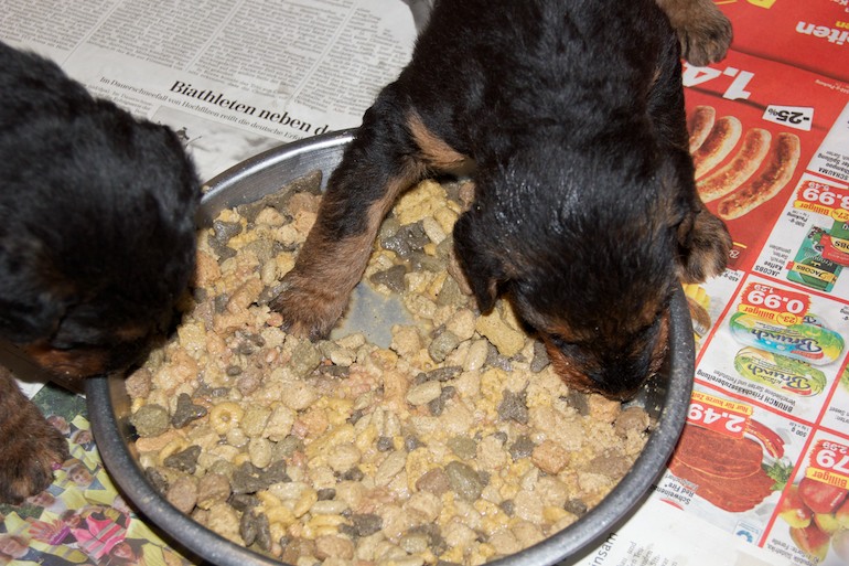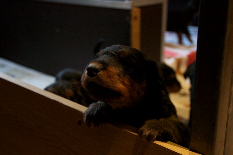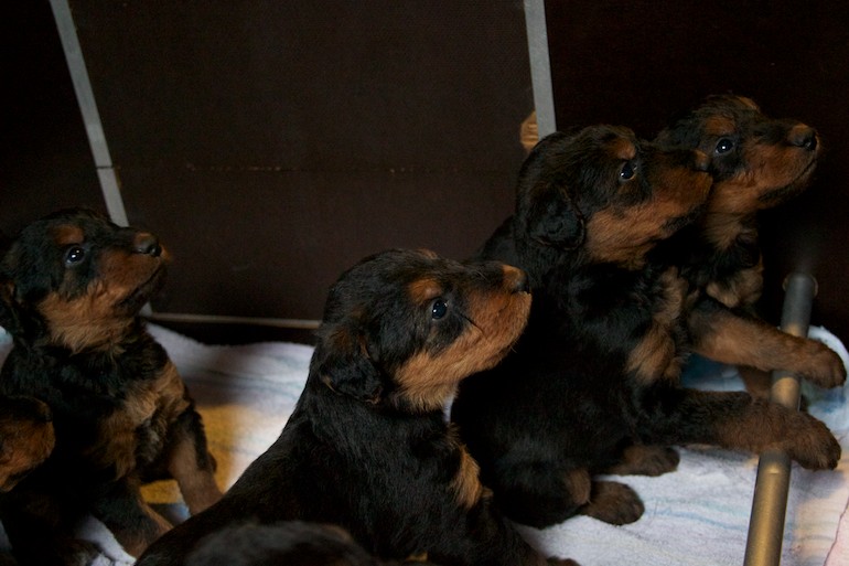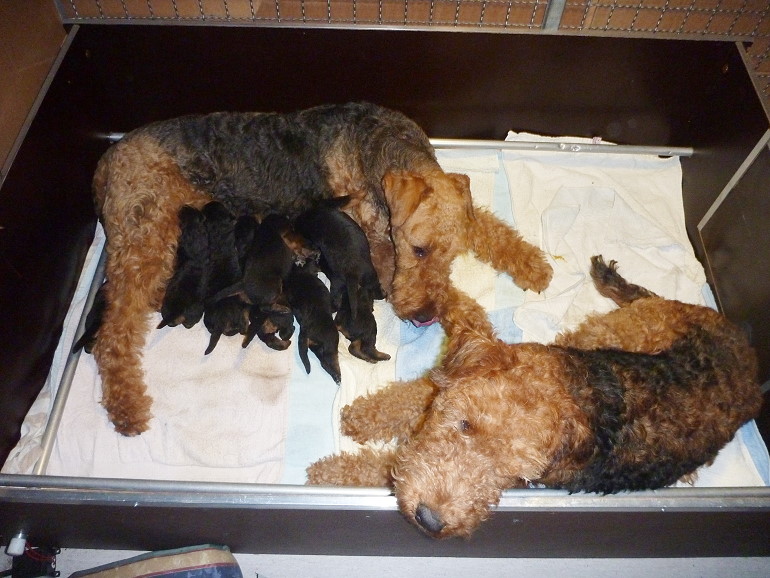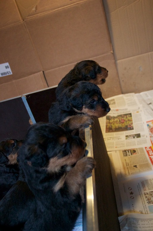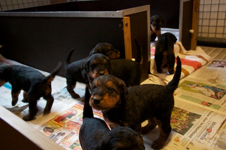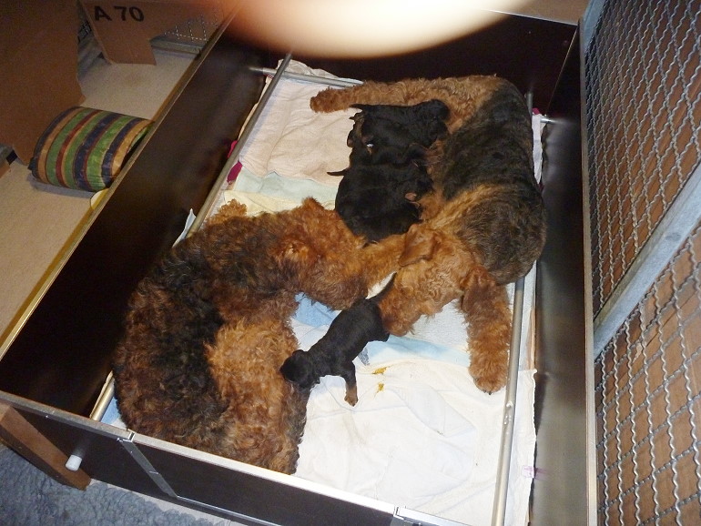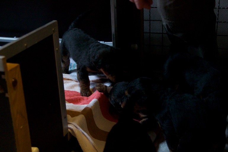 Bentes Kinder gedeihen prächtig. Sie sind schon recht unternehmungslustig und krabbeln eifrig hinter ihrer Mama her. Aber sie müssen natürlich auch noch viel schlafen, damit sie große starke Airedales werden. (Und damit die Bärte schön wachsen 😉 )
