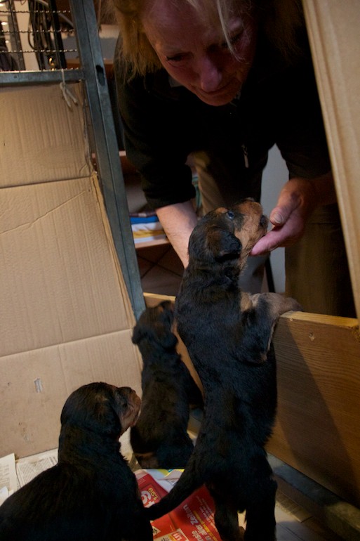 gestern wurden nun das erste Mal Bentes Welpen abgelichtet. Die Welpen sind zu diesem Zeitpunkt 4 (vier!!) Tage alt. Da sind sie noch ganz klein und schwarz. Und sie sind jetzt schon sehr propere, agile Kerlchen, während sich Mama Bente ganz vorbildlich um die Kleinen kümmert.