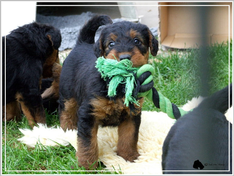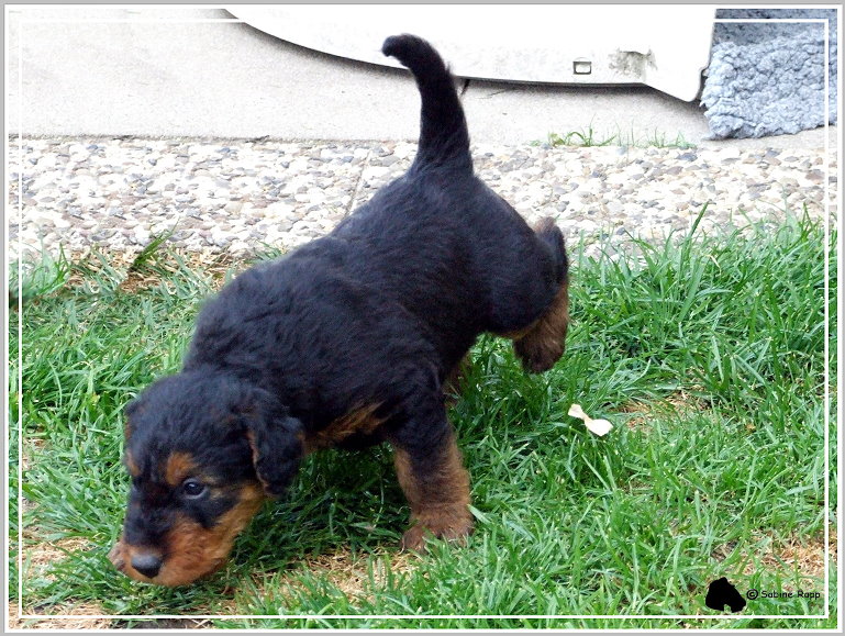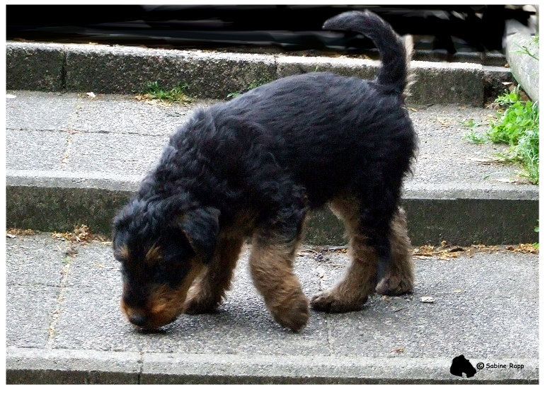 ich möchte mich doch einmal ‚groß‘ zeigen. So sehe ich ‚Coco‘ alias Rana heute aus. Inge und Hannes sind mit mir, der ‚Rennmaus‘ sehr zufrieden. Ich bin ganz lieb und freundlich, weiß aber was ich will. Wie ein echter Airedale eben.