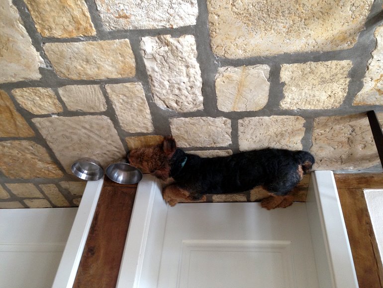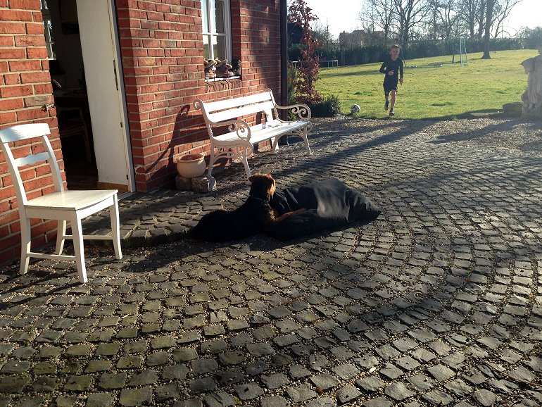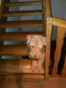 Auf der Treppe sitze ich immer, wenn ich alleine zuhause bleiben muss. Frauchen sagt dann immer, pass schön auf und lass niemand rein. Gefällt mir gar nicht, ich würde lieber mitkommen und Auto fahren.