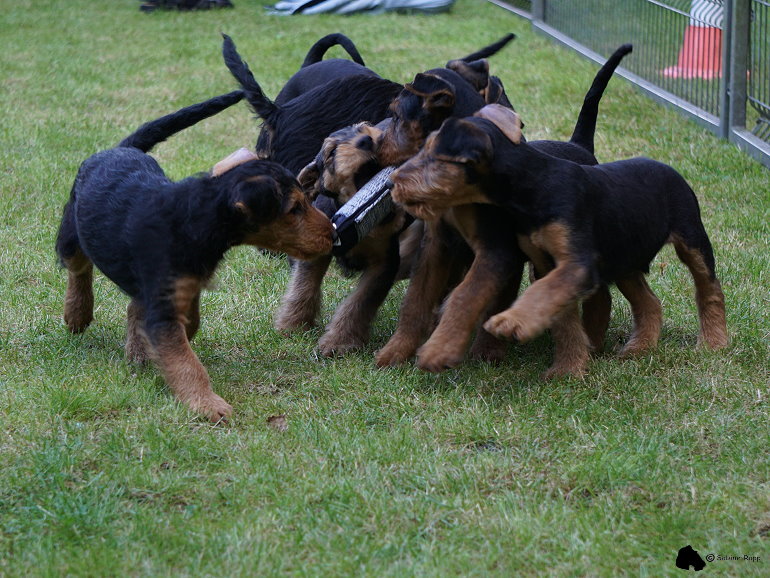 Endlich erlaubt es das Wetter, dass Ronjas Kinder nach Herzenslust auf der Wiese toben können. Neues Spielzeug wird auf seine Haltbarkeit getestet und auch der Tunnel muss (aus)probiert werden. Einige Kinder waren bereits beim Frisör. Sind das nicht hübsche kleine Airedale Terrier?!